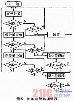 附加功能子程序包括正常計(jì)數(shù)、數(shù)據(jù)保持、最大值跟蹤、最小值跟蹤和清零的功能。對(duì)附加功能的實(shí)現(xiàn)均是通過控制CK和DATA信號(hào)線完成,附加功能轉(zhuǎn)換流程如圖5所示。給CK信號(hào)線一個(gè)負(fù)脈沖,即可完成清零操作;在正常計(jì)數(shù)狀態(tài)下將DATA信號(hào)線置為高電平,容柵傳感器將進(jìn)入保數(shù)功能;如果再將CK信號(hào)線置為低電平,容柵傳感器進(jìn)入最大值跟蹤功能;內(nèi)部專用芯片將用新測(cè)得的數(shù)據(jù)與上一個(gè)數(shù)據(jù)進(jìn)行比較,如果新測(cè)得數(shù)據(jù)大,則替換掉,否則丟棄。可以在上位機(jī)上通過USB測(cè)試軟件發(fā)送相關(guān)命令來控制系統(tǒng)進(jìn)行操作。程序中設(shè)定一個(gè)字節(jié)的變量來存放從上位機(jī)接收到的命令,當(dāng)判斷是其中的一個(gè)命令時(shí)就調(diào)用相應(yīng)的處理程序完成操作。