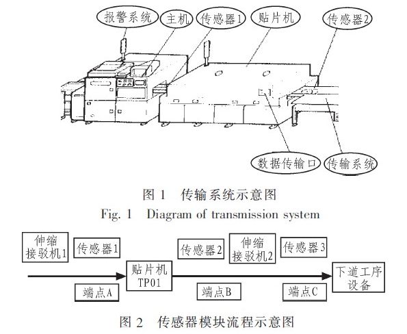 如傳感器流程示意圖1、圖2所示,假設一塊PCB的編號為01,首先從通過傳輸設備伸縮接駁機(編號為CS01)進入設備貼片機(編號為TP01)進行操作貼片流程,完畢之后再從貼片機(編號為TP01)進入傳輸設備接駁機(編號為CS02),再通過傳輸設備接駁機(編號為CS02)進入下一個SMT生產設備,如此反復。