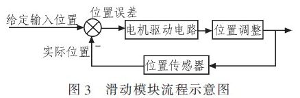 如圖3滑動模塊流程示意圖所示,本系統(tǒng)方案設計在傳輸系統(tǒng)和SMT生產設備的連接處,增設一個滑動裝置,主要由滑動板、滾珠和位置傳感器組成,形成了一個閉環(huán)控制,起到平衡作用。在生產過程中,由模塊裝置上的位置傳感器實時將實際位置信號反饋給系統(tǒng),與給定輸入位置信號相比較產生一個位置誤差信號,然后由這個誤差信號驅動電機運轉進行位置調整。當設備平衡時,位置誤差為零,不進行位置調整;當傳輸機有偏斜時,位置誤差不為零,由它驅動電機運轉,使設備進行一定的位置調整。通過這套裝置,消除由振動產生位置偏移、利于整個生產線的生產、增強各設備之間銜接。