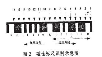 根據(jù)磁敏傳感原理,“凹槽”和“凸槽“會導(dǎo)致不同的磁場強度,從而使磁敏元件相應(yīng)地輸出不同的電半信號“0”或“1”,形成數(shù)值碼,用于確定位移的粗讀值;而標志位R碼寬兩倍于碼元“1”寬度的特點,使得識別后的序列出現(xiàn)具有固定特征的標識碼,它用于精讀數(shù)。