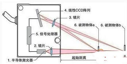 激光發(fā)射器通過鏡頭將可見紅色激光射向物體表面,經(jīng)物體反射的激光通過接受器鏡頭,被內(nèi)部的CCD線性相機接受,根據(jù)不同的距離,CCD線性相機可以在不同的角度下“看見”這個光點。根據(jù)這個角度即知的激光和相機之間的距離,數(shù)字信號處理器就能計算出傳感器和被測物之間的距離。