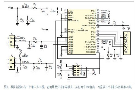 本設(shè)計中的電路包括一個混合信號微控制器、一只USBUART(通用異步接收器/發(fā)射器),還有一個新穎的自適應模擬傳感器輸入電路。此電路可以將多種類型的傳感器接到設(shè)計的兩個模擬輸入通道上,在一個USB主機上控制這些設(shè)備,讀出測量數(shù)據(jù)。USB連接為電路提供電源。在計算機上就能用簡單指令控制設(shè)備;甚至用終端軟件也可以做測量工作。8051核有免費的工具, 便于做編程工作, 如IDE(集成開發(fā)環(huán)境)、調(diào)試器以及C編譯器?! ?br />