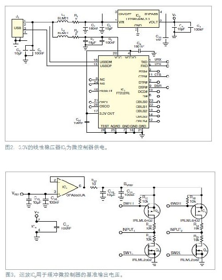 3.3V的線性穩(wěn)壓器IC2為微控制器供電(圖2)。從USB端口通過磁珠與濾波器,就可以直接為USB芯片IC1供電。這款芯片是常見而可靠的USBUART芯片,可與使用任何操作系統(tǒng)的計算機通信。運放IC4用作微控制器基準輸出的緩沖(圖3)。