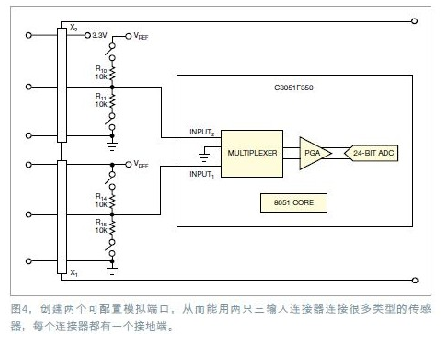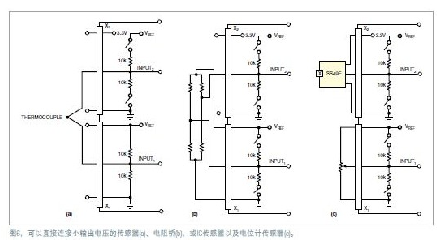 高分辨率ADC與PGA可以直接連接熱電偶(圖6)。通過切換一個通道上的上拉電阻和下拉電阻,就可以實現(xiàn)所需的偏置點。關(guān)掉所有內(nèi)置電阻,就可以采用直接連接的橋式傳感器(如測壓元件和壓力傳感器)。這些情況下,應使ADC工作在差分模式。讓所有開關(guān)開路亦適合于采用電位器輸入或IC 傳感器的場合,如SS49E霍爾效應磁場傳感器?! ?/p>