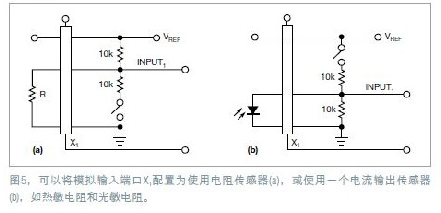 模擬輸入架構(gòu)能夠直接連接多種類型的傳感器。例如,可以在接地端與輸入端之間連接熱敏電阻或光敏電阻,并接通上拉電阻,構(gòu)成一個分壓器;片上的ADC可以直接對這個分壓器的輸出做數(shù)字化(圖5)。這種方案還采用了比率工作方式,意味著ADC使用與分壓器驅(qū)動電壓相同的電壓基準。電流輸出傳感器也可以像光電二極管那樣連接,即直接連到接地端與輸入端之間。切換到下拉電阻,使光電流能產(chǎn)生一個電壓?! ?/p>