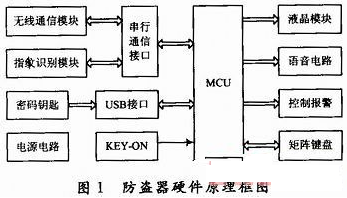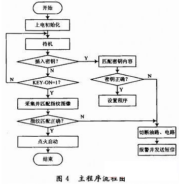 主要工作原理如下:車主停車熄火后,防盜器進(jìn)入鎖定狀態(tài)。此時(shí)如果汽車鑰匙不在ON位,就不能進(jìn)行指紋識(shí)別;只有當(dāng)汽車鑰匙在ON位,才可用指紋識(shí)別解鎖防盜器并自動(dòng)點(diǎn)火。在鎖定狀態(tài)下,汽車的油路、電路等被切斷,汽車鑰匙無法點(diǎn)火;如果強(qiáng)行剪斷指紋采集模塊和控制盒的連線,或者不識(shí)別指紋而強(qiáng)行用汽車鑰匙點(diǎn)火,汽車會(huì)通過鳴號(hào)、閃燈和無線通信網(wǎng)絡(luò)報(bào)警。在鎖定狀態(tài)插入密碼鑰匙可進(jìn)入解鎖狀態(tài),并可根據(jù)LCD和語音提示通過小鍵盤進(jìn)行指紋注冊/刪除、手機(jī)號(hào)碼設(shè)置和應(yīng)急點(diǎn)火等操作。