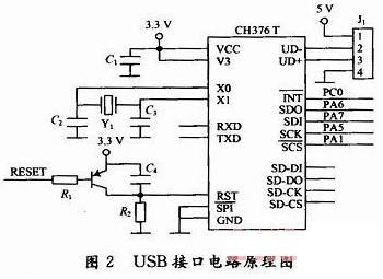 USB接口電路主要由文件管理控制芯片CH376T實(shí)現(xiàn),CH376T支持USB設(shè)備方式和USB主機(jī)方式,并且內(nèi)置了USB通信協(xié)議的基本固件、處理MassStorage海量存儲(chǔ)設(shè)備的專用通信協(xié)議的固件、SD卡的通信接口固件、FAT16和FAT32以及FAT12文件系統(tǒng)的管理固件,支持常用的USB存儲(chǔ)設(shè)備和SD卡。CH376T支持二種通信接口:SPI接口和異步串口。本設(shè)計(jì)采用SPI接口與MCU進(jìn)行數(shù)據(jù)通信,電路連接方式如圖2所示。串行數(shù)據(jù)輸入SDI、輸出SDO和時(shí)鐘SCK分別接STM32F103VC的SPI1_MOSI,SPI1_MISO和SPI1_SCK,中斷請求輸出端INT接PC0,片選端SCS由PA1控制。圖2中的RESET是系統(tǒng)復(fù)位信號(hào),晶體振蕩器Y1選12 MHz。當(dāng)車主要進(jìn)行指紋注冊/刪除或應(yīng)急點(diǎn)火時(shí),將密碼鑰匙(U盤)接入J1以讀取密碼信息。