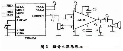 語音電路原理圖如圖3所示,由美國ISD公司的語音芯片ISD4004-16和美國國家半導(dǎo)體公司的音頻功率放大器LM386等元件構(gòu)成。ISD4004 -16錄放時(shí)間為16 min(可分段),它采用CMOS技術(shù),單電源3 V工作,內(nèi)含振蕩器、抗混疊濾波器、平滑濾波器、音頻放大器、自動(dòng)靜噪及高密度多電平閃爍存貯陳列。它內(nèi)置微控制器SPI總線串行通信接口。可將模擬語音數(shù)據(jù)直接寫入單個(gè)存儲(chǔ)單元,不需通過A/D或D/A轉(zhuǎn)換。使得ISD語音電路具有音質(zhì)自然、使用方便、單片存儲(chǔ)、反復(fù)錄放、低功耗、抗斷電等許多優(yōu)點(diǎn)。LM386工作電壓范圍寬,電壓增益可調(diào)。具有自身功耗低、電壓增益可調(diào)整電源電壓范圍大、外接元件少和總諧波失真小等特點(diǎn)。本設(shè)計(jì)中STM32F103VC通過SPI2給ISD4004傳送語音信息。圖3中的V1和V2分別經(jīng)三極管與+3.3 V和+12 V電源相連,三極管的通斷由STM32F103VC的PCI1和PCI2控制,只有在需要語音提示時(shí),才使三極管導(dǎo)通給ISD4004和LM386供電。
