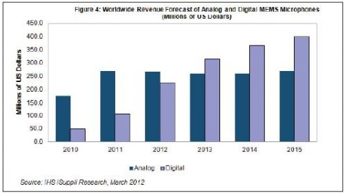 據(jù)IHS公司的MEMS專題報(bào)告,由于具有對電磁干擾的免疫力較高和設(shè)計(jì)階段具有更大的靈活性等優(yōu)點(diǎn),越來越多地被用于手機(jī)、筆記本以及蘋果iPad等暢銷產(chǎn)品之中,數(shù)字MEMS麥克風(fēng)的銷售額明年將超過模擬產(chǎn)品。