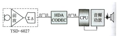 數(shù)字傳聲器,顧名思義就是直接輸出數(shù)字脈沖信號的傳聲器電聲器件。從應用角度來劃分,可以分為兩類:一類為USB接口的數(shù)字傳聲器,其核心電聲換能器件仍為模擬音頻輸出信號,經(jīng)過USB接口音效芯片轉換為PC格式的數(shù)字信號輸出接口,此類傳聲器多數(shù)作為PC周邊配套外設,如USB接口錄音傳聲器、USB接口耳麥等,嚴格說來,此類數(shù)字傳聲器應稱為數(shù)字接口傳聲器。另一類為真正意義上的數(shù)字傳聲器,此類傳聲器采用內置阻抗變換、前置增益、A/D編碼器的IC芯片,作為電聲換能器件直接輸出的便是脈沖數(shù)字信號,可以直接與相應的編解碼芯片( CODEC)進行數(shù)字信號的傳輸。數(shù)字傳聲器接口原理如圖1
