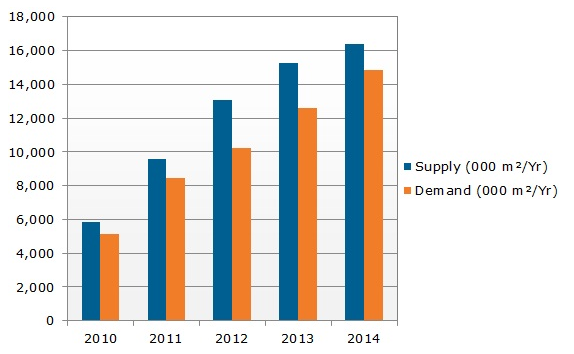 根據(jù)NPD DisplaySearch觸控感應(yīng)器產(chǎn)能統(tǒng)計(jì)報(bào)告Touch Sensor Manufacturing Capacity指出,2011年主要的觸控傳感器,包含電阻式、投射式電容、單片式投射式電容(sensor-on-cover)和面板內(nèi)嵌式投射式電容(on-cell)觸控感應(yīng)器的總產(chǎn)量為960萬(wàn)平方米,較2010年的580萬(wàn)平方米取得了66%的年增長(zhǎng)率。NPD DisplaySearch預(yù)測(cè),2012年觸控感應(yīng)器將達(dá)到1千3百萬(wàn)平方米,并將于2014年上升到1千640萬(wàn)平方米。
