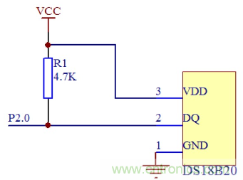 設(shè)計(jì)中采用支持“一線總線”接口、抗干擾性強(qiáng)、外部電路簡單、精確度高的DS18B20溫度傳感器對溫度的實(shí)時測量。其中,DS18B20 管腳2 即DQ 接在MSP430F149 的P2.0管腳,如圖所示。