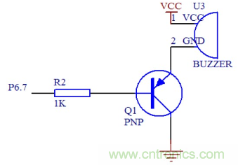 蜂鳴器在微處理器判斷為火災(zāi)時發(fā)出報(bào)警指示音。由于單片機(jī)的I/O 口驅(qū)動能力有限,選用PNP型晶體管2N5401 組成晶體管驅(qū)動電路來驅(qū)動壓電式蜂鳴器。