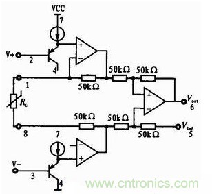 測(cè)量300℃的傳感器用Pt1000的鉑電阻,測(cè)量范圍:-50~300℃:0℃時(shí)電阻阻值1 000 Ω,300℃時(shí)電阻阻值2 120.515 Ω,反映溫度的物理量是電阻,因此需要設(shè)計(jì)電橋?qū)㈦娮璧淖兓哭D(zhuǎn)換位差模電壓的變換量,然后進(jìn)行信號(hào)放大和電平抬升。