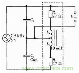 如圖1如果沒有C1和C2為普通半橋電路,虛線框中為電感傳感器的等效電路,傳感器測(cè)頭的位移帶動(dòng)螺線管中鐵芯上下移動(dòng),從而改變上下兩個(gè)線圈的電感值。將兩線圈等效成純電阻和純電感的串聯(lián),如圖中R1和L1組成上線圈,R2和L2組成下線圈,輸出接在上線圈上。實(shí)際傳感器中線圈與輸出的接線不會(huì)變,只是通過鐵芯移動(dòng)來改變電感,所以R1和R2固定不變。