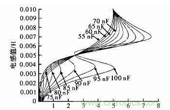 對(duì)于半橋時(shí)電路II由于希望鐵芯在最下方時(shí)回路II諧振,最上方時(shí)回路I諧振,因?yàn)長(zhǎng)1和L2的變化范圍為3~7 mH。L2為7 mH時(shí)回路II諧振,L1為7 mH時(shí)回路I諧振。按照仿真條件計(jì)算C1=C2=65 nF。簡(jiǎn)化仿真不妨取C1=C2,在65 nF附近從55~100 nF間隔5 nF進(jìn)行仿真,觀察電路性能,仿真結(jié)果如圖2所示。