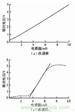 經(jīng)Matlab計(jì)算普通半橋在3~7 mH段,電壓變化范圍1.5~3.5 V,電壓對(duì)電感的靈敏度為0.5V/mH。線性度近似為1。對(duì)圖3(b)采用最小二乘法擬合直線后,在3.8~6.3 mH段,輸出電壓的變化范圍0.77~4.39 V。線性度可達(dá)2.39%,靈敏度為1.448 V/mH。
