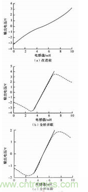 普通全橋在3.8~6.3 mH段,電壓變化范圍為-1.2~+1.3 V,電壓對(duì)電感的靈敏度為1 V/mH。線性度近似為1.38。對(duì)圖4(b)和圖4(c)使用Matlab進(jìn)行最小擬合直線如圖所示,在3.8~6.3 mH段,并聯(lián)方式輸出電壓的變化范圍為-2.66~+2.66V,靈敏度為2.130V/mH線性度可達(dá)1.68%。串聯(lián)方式的輸出電壓范圍約為-1.25~+1.25V,靈敏度約為2.130V/mH線性度可達(dá)1.33%。