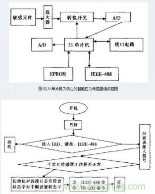 總體結(jié)構(gòu)設(shè)計(jì)。半導(dǎo)體敏元件、放大器、轉(zhuǎn)換開(kāi)關(guān)、雙積分A/D轉(zhuǎn)換器、單片機(jī)、接口電路、IEEE~488標(biāo)準(zhǔn)接口、存儲(chǔ)器以及部分外圍電路組合在一起形成了智能壓力傳感器。