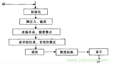 根據(jù)圖2的源程序流程圖可設(shè)計(jì):安裝好智能壓力傳感器一進(jìn)行標(biāo)定一將信號(hào)轉(zhuǎn)換成數(shù)字碼一存人E.PROM中一理想輸出。如圖2所示。