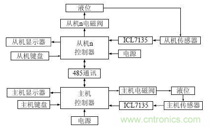 基本工作流程為:主機(jī)通過鍵盤設(shè)定自己和從機(jī)的液位,超聲波傳感器測出當(dāng)前水位對應(yīng)的電壓值,再經(jīng)過ICL7135 模數(shù)轉(zhuǎn)化送入控制器與設(shè)定值比較,單片機(jī)通過控制電磁閥調(diào)節(jié)主機(jī)液位,并把設(shè)定值與當(dāng)前值顯示在LCD 上;主機(jī)控制器通過485 通訊對從機(jī)控制器傳輸設(shè)定值,從機(jī)控制器也可以如主機(jī)控制器一樣對液位進(jìn)行控制,并通過LCD 顯示主機(jī)給定值與當(dāng)前液位值;并利用485 通訊把從機(jī)當(dāng)前液位傳送給主機(jī)顯示出來。
