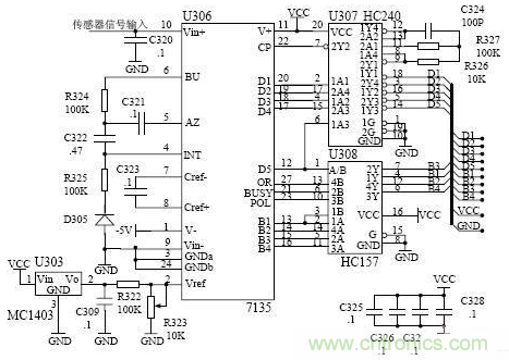 本電路由一個小型集成電路來實(shí)現(xiàn),采樣后的信號經(jīng)過電位器送到ICL7135 進(jìn)行處理,將處理后信號直接送到單片機(jī)最小系統(tǒng)。ICL7135 量程為0~2V,基準(zhǔn)電壓由MC1403 輸出(2.5V)分壓獲得1V 電壓。