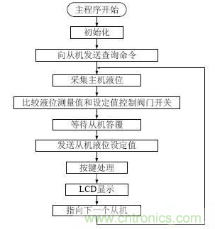 軟件部分主要是利用51 系列單片機(jī)作控制器,傳感器輸出電壓進(jìn)行采樣,將采樣值與設(shè)定值比較,單片機(jī)對電磁閥控制來調(diào)節(jié)液位,主機(jī)通過485 通訊給分機(jī)設(shè)定數(shù)值,分機(jī)控制器對分機(jī)液位進(jìn)行控制。軟件部分包括ICL7135 采樣部分、485 通訊部分、數(shù)字處理部分、顯示部分、鍵盤部分等。為了避免在傳感器移動造成測量數(shù)據(jù)不準(zhǔn)確,特別增加了調(diào)零功能,進(jìn)一步提高了系統(tǒng)的準(zhǔn)確性。主程序流程圖如圖4 所示。