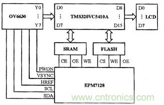 系統(tǒng)中的核心處理芯片選用TI公司的加強型定點DSP芯片TMS320VC5410A,該DSP的工作頻率可達160 MHz,內部有64KBRAM空間可以靈活的映射為數據或程序存儲空間。由于DSP的內部存儲空間有限,所以,本設計在外部擴展了一大小為1 MB的SRAM數據存儲器CY7C1021和256 K的FLASH程序存儲器SST39VF400A??刂菩酒珻PLD選用Altera公司的MAX7000系列芯片EPM7128SLC84-15。該芯片包含84個I/O管腳、128個宏單元,每16個宏單元可組成一個邏輯陣列塊,工作電壓為5.0 V。該芯片在系統(tǒng)中處于總體時序控制地位,既用于給圖像傳感器芯片提供控制信號。也用于SRAM和FLASH的片選和讀寫控制,同時還負責LCD的顯示控制。