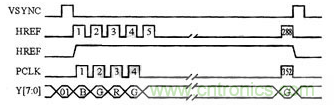 圖2中,每一個幀同步信號VSYNC周期包含288個水平同步信號HREF脈沖,而每一個HREF周期包含352個PCLK時鐘脈沖,每一個PCLK時鐘可輸出一個RGB像素的視頻數據。