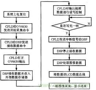由于圖像像素點的個數已知,即數據個數已知,故在計數完畢后,CPLD將發(fā)出計數完畢信號。而DSP在接收到中止信號后,即可開始讀取RAM中的數據,并對數據進行壓縮和相應的處理,然后把數據放到LCD液晶屏的數據總線,最后將采集到的圖像在液晶屏上顯示出來。圖3為圖像采集系統(tǒng)的軟件流程圖。