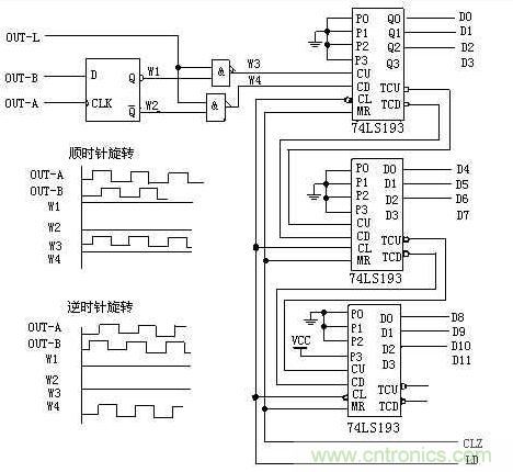 當(dāng)光電編碼器順時(shí)針旋轉(zhuǎn)時(shí),通道A輸出波形超前通道B輸出波形90°,D觸發(fā)器輸出Q(波形W1)為高電平,Q(波形W2)為低電平,上面與非門打開,計(jì)數(shù)脈沖通過(波形W3),送至雙向計(jì)數(shù)器74LS193的加脈沖輸入端CU,進(jìn)行加法計(jì)數(shù);此時(shí),下面與非門關(guān)閉,其輸出為高電平(波形W4)。當(dāng)光電編碼器逆時(shí)針旋轉(zhuǎn)時(shí),通道A輸出波形比通道B輸出波形延遲90°,D觸發(fā)器輸出Q(波形W1)為低電平,Q(波形W2)為高電平,上面與非門關(guān)閉,其輸出為高電平(波形W3);此時(shí),下面與非門打開,計(jì)數(shù)脈沖通過(波形W4),送至雙向計(jì)數(shù)器74LS193的減脈沖輸入端CD,進(jìn)行減法計(jì)數(shù)。