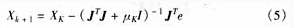 式中,J為Jacobian矩陣,包括網(wǎng)絡(luò)誤差項(xiàng)相對(duì)于權(quán)重和閾值的一階微分 ,e為網(wǎng)絡(luò)的誤差項(xiàng)。Jacobian矩陣可以利用標(biāo)準(zhǔn)的BP算法得出,這比直 接計(jì)算Hessian矩陣簡(jiǎn)單得多。迭代式為: