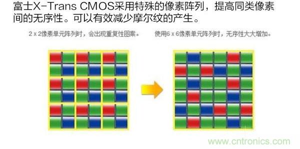 傳統(tǒng)的拜耳陣列傳感器,R/G/B三色的點陣距離相同,因此在拍攝特定密度的規(guī)律物體時,就容易產生摩爾紋。富士的X-Trans CMOS采用了全新色彩濾鏡陣列,降低了傳感器像素間的規(guī)律性,使得像素點本身有類似膠片銀鹽顆粒的不規(guī)則排列效果,從而降低摩爾紋的產生。