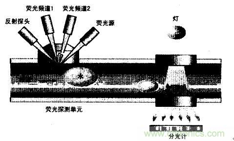 發(fā)光頻率為f的激光經(jīng)透鏡,光纖被送到表皮組織。對于不動的組織,例如血管壁,所反射的光不產(chǎn)生頻移;而對于皮層毛細血管里流速為 的紅細胞,反射光要產(chǎn)生頻移,其頻率變化為△f;發(fā)生頻移的反射光強度與紅細胞的濃度成比例,頻率的變化值可與紅細胞的運動速度成正比。發(fā)射光經(jīng)光纖收集后,先在光檢測器上進行混頻,然后進人信號處理儀,從而得到紅細胞的運動速度和濃度。