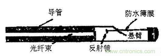 1、壓力測量。目前臨床上應用的壓力傳感器主要用來測量血管內(nèi)的血壓、顱內(nèi)壓、心內(nèi)壓、膀胱和尿道壓力等。用來測量血壓的壓力傳感器示意見圖3。其中對壓力敏感的部分是在探針導管末端側(cè)壁上的一塊防水薄膜,一面帶有懸臂的微型反射鏡與薄膜相連,反射鏡對面是一束光纖,用來傳遞入射光到反射鏡,同時也將反射光傳送出來。當薄膜上有壓力作用時。薄膜發(fā)生形變且能帶動懸臂使反射鏡角度發(fā)生改變,從光纖傳來的光束照射到反光鏡上,再反射到光纖的端點。由于反射光的方向隨反射鏡角度的變化而改變,因此光纖接收到的反射光的強度也隨之變化。這一變化通過光纖傳到另一端的光電探測器變成電信號,這樣通過電壓的變化便可知探針處的壓力大小。