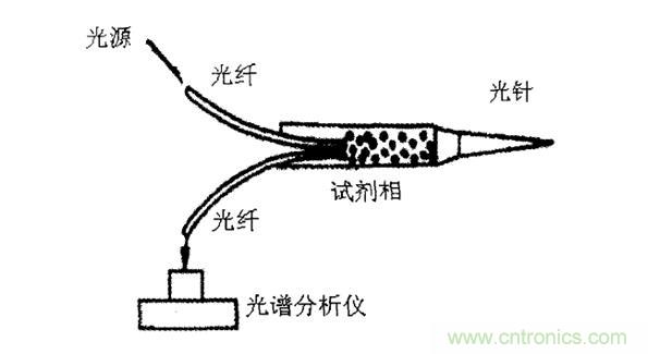 用來測定活體組織和血液值pH光纖光譜傳感器示意圖,如圖5所示。其工作原理是利用發(fā)射光、透射光的強度隨波長的分布光譜來進行測量。這種傳感器將兩根光纖插入可透過離子的纖維素膜盒中.膜盒內(nèi)裝有試劑,當把針頭插入組織或血管后,體液滲入試劑,導致試劑吸收某種波長的光。用光譜分析儀測出此種變化,即可求得血液或組織的pH值。