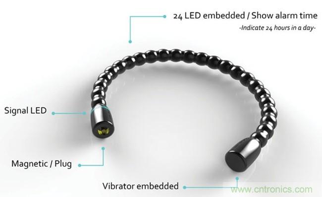 而手鏈采用磁性連接頭作為連接環(huán),連接頭上有指示燈,通過不同的顏色來(lái)指示電池的電量,連接頭也有USB接口,可以通過適配器來(lái)為智能手鏈充電。同時(shí)這款智能手鏈內(nèi)置了藍(lán)牙模塊,可以通過藍(lán)牙連接智能手機(jī),用戶可以通過手機(jī)程序來(lái)設(shè)置鬧鐘時(shí)間,讓智能手鏈用溫柔的震動(dòng)喚醒自己。