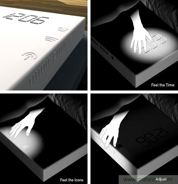 開關(guān)、音量調(diào)節(jié)、功能設(shè)置等凸起按鈕,它們都被隱藏在床單下面,不必睜開雙眼,通過觸摸,我們就可以知曉和調(diào)節(jié)時(shí)間。這些模塊是采用一種仿生材料制成的,這種材料又被稱為人工肌肉。它通過收縮或者膨脹來(lái)改變外形,從而達(dá)到變幻時(shí)間顯示數(shù)字的效果。