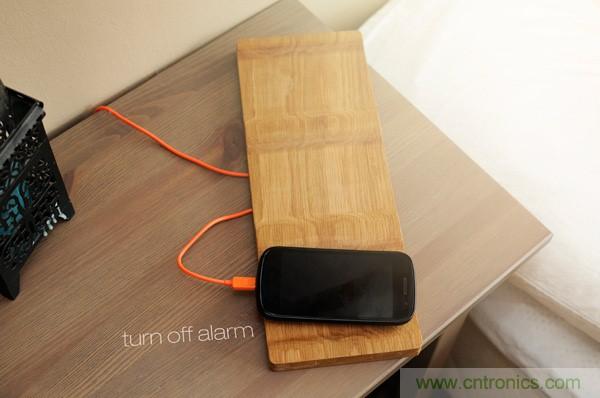 而Tangible Alarm的設(shè)計(jì)Tangible Alarm就像一塊長(zhǎng)條形的木板,可以無(wú)線同步手機(jī)鬧鐘,通過簡(jiǎn)單的移動(dòng)手機(jī),完成各種鬧鐘狀態(tài)的操作。Tangible Alarm共有三個(gè)移動(dòng)的位置,包括小睡移動(dòng)到右側(cè)、關(guān)閉移動(dòng)到左側(cè)以及中間即是當(dāng)前鬧鐘設(shè)置狀態(tài)。