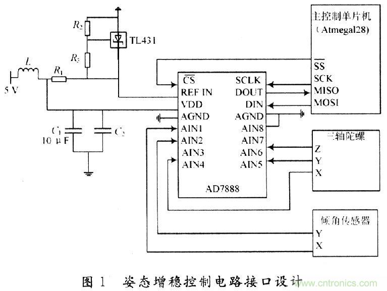 無人機內(nèi)回路控制作為外回路控制的基礎(chǔ),對其能否穩(wěn)定飛行起著至關(guān)重要的作用。該系統(tǒng)中,內(nèi)回路是由三軸陀螺和傾角傳感器構(gòu)成的姿態(tài)增穩(wěn)控制回路。主要由主控制單片機、A/D采樣芯片、三軸陀螺儀和傾角傳感器組成。主控制單片機通過SPI串行總線與A/D采樣芯片相連,通過A/D采樣芯片獲得三軸陀螺儀的角速率與傾角傳感器的橫滾角和俯仰角,然后進行姿態(tài)信息融合,得到無人機俯仰和橫滾的姿態(tài)信息。主要接口連接情況如圖1所示。