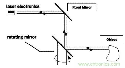 這套發(fā)射/接收組件和旋轉(zhuǎn)鏡面結(jié)合在一起,能掃描至少一個(gè)平面。鏡面不只反射二極管發(fā)出去的光,而且也能把反射回來的光再反射給接收器。通過旋轉(zhuǎn)鏡面,能夠?qū)崿F(xiàn)90到180度的視角,并且大大降低系統(tǒng)設(shè)計(jì)和制造的復(fù)雜度,因?yàn)殓R面是這里面唯一的運(yùn)動(dòng)機(jī)構(gòu)。