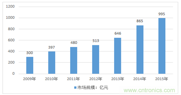2010-2015年中國(guó)傳感器市場(chǎng)規(guī)模走勢(shì)圖
