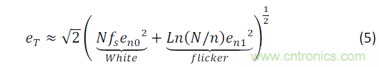 在算式中,fs 是采樣頻率, n是CDS 因子(通常n=2)。如圖3顯示,取決于采樣頻率,這一濾波或多或少地去除1/f噪聲頻率成分,尤其是當(dāng)采樣頻率fs很高的時候 顯著(換句話說,電荷進(jìn)出“陷阱”的動作將慢于CDS頻率)。HCDS濾波器結(jié)合放大鏈的低通濾波器可以簡化為一個如圖3所示的等效帶通濾波器。圖中的eqBP1 對應(yīng)一個一級帶通濾波器。這裡eqBP1的噪聲頻譜函數(shù)要除以2,以得到一個帶有HCDS函數(shù)的等效集成噪聲功率 。eqBP2 是eqBP1的陷波估算值。要取得集成噪聲功率,eqBP2 的上限和下限分別按照下列算式進(jìn)行倍增: