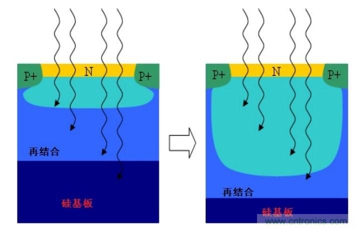因?yàn)檫@個原因,ITCCD不能從BSI中獲益。而高端CCD因?yàn)槭褂么怪笨箷灩に?,所以沒有這一限制。而CMOS也具有同一特點(diǎn):在薄的感測層上,因?yàn)殡姾刹粫谙袼刂g滲透,所以沒有串?dāng)_的缺點(diǎn)。結(jié)果是ITCCD和標(biāo)準(zhǔn)CIS都能夠?qū)崿F(xiàn)良好的空域解析度或調(diào)制轉(zhuǎn)換函數(shù)(modulated transfer function,MTF) 。要增加NIR部份和敏感度,需要顯著增加物料厚度,但是厚物料會增加光電串?dāng)_,引致MTF衰減。成像質(zhì)量是MTF和QE的綜合結(jié)果(即所謂的檢測量子效率Detective Quantum Efficiency,DQE),所以必需同時考量空域和時域因素。圖6顯示利用硅摻雜方法恢復(fù)MTF的深耗盡(deep depletion)光電二極管。一般來說,CIS使用類似集成電路的常用技術(shù)(特別是DRAM/內(nèi)存工藝)生產(chǎn),所以不會牽涉上述的特定工藝配方。不過近期的技術(shù)研究文章展示適用于CIS的特定工藝導(dǎo)入方案,能實(shí)現(xiàn)出色的QE改進(jìn)甚至相對接近高端CCD的水平(見圖5)。最新的CMOS技術(shù)趨勢可說是突飛猛進(jìn),引進(jìn)了如導(dǎo)光板、深槽隔離(deep trench isolation,DTI)、埋藏微透鏡,以及在光敏范圍下嵌入包含像素晶體管的迭層芯片等技術(shù)。