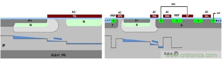 “嵌入式光電二極管” (pinned photodiode,PPD) 或“空穴堆積二極管”(hole accumulation diode,HAD) 最初開發(fā)目的是消除延遲并把全部電荷從光電二極管轉(zhuǎn)移到ITCCD寄存器[12]。CMOS圖像傳感器的一個重大發(fā)展是在2000年代初期引進(jìn)ITCCD光電二極管結(jié)構(gòu)[11],如圖7所示。在CMOS中,像素結(jié)構(gòu)多數(shù)以每像素的晶體管數(shù)目來表示。大部分 CMOS圖像傳感器傾向使用電子卷簾快門(electronic rolling shutter),這有助于集成并只需少至三個晶體管 (3T)就能實(shí)現(xiàn)。雖然有結(jié)構(gòu)簡單的優(yōu)點(diǎn),3T像素結(jié)構(gòu)的缺點(diǎn)是電路來自kT/C (或溫度) 噪聲的像素生成時域噪聲會較大,而且不能輕易消除。
