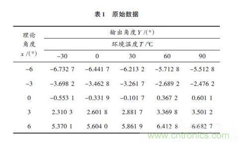 由于各軸的檢測原理是相同的,因此本論文采用x軸的檢測數(shù)據進行實驗驗證。主要的實驗儀器有被測姿態(tài)傳感器、經緯儀、高低恒溫箱、高精度角度檢測儀等。表1所得數(shù)據是未經溫度補償時的實驗數(shù)據,即原始數(shù)據。