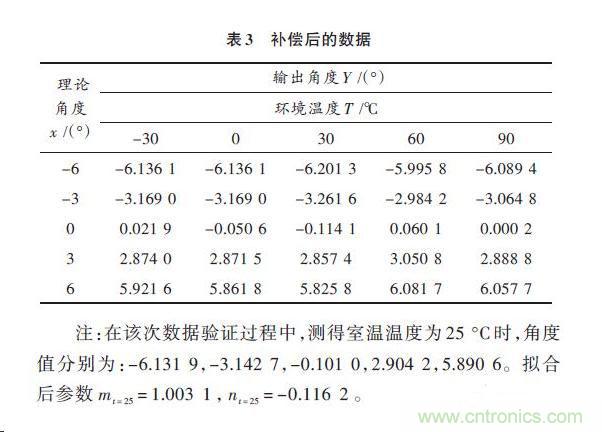 根據式(1)、(2)、(7)可得補償后的輸出值。償后的數(shù)據如表3所示。在表1中未補償前的最大誤差角度為0.682 7°,表3中補償后的最大誤差角度為0.261 6°,相對減少的誤差角度為0.421 1°。