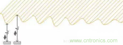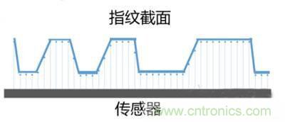 其原理是將電容感整合于一塊芯片中,當指紋按壓芯片表面時,內(nèi)部電容感測器會根據(jù)指紋波峰與波谷而產(chǎn)生的電荷差,從而形成指紋影像。如下簡圖,可以把上面的凹凸認為是指紋的谷和脊,那么同傳感器就會形成不同的電容差,這樣傳感器就可以根據(jù)這些不同的電容差畫出指紋的紋理。