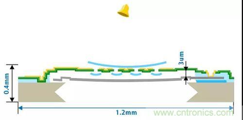 在封裝內(nèi)部,裝有懸掛在真空環(huán)境中的硅薄膜(隔膜),檢測(cè)外部空氣進(jìn)入隔膜后所產(chǎn)生的氣壓變化。為了提高傳感器的檢測(cè)精度,硅膜片必須做到盡可能薄,以便在感觸細(xì)微的氣壓后可以產(chǎn)生巨大的變形。