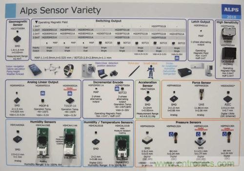 日本阿爾卑斯電氣株式會社(Alps Electric)展示其傳感器組合(下圖),這同時(shí)也可作為傳感器領(lǐng)域應(yīng)用多樣化的一個(gè)指標(biāo)。該公司并未在活動(dòng)中發(fā)表新芯片,而是與網(wǎng)關(guān)供貨商、美國云端運(yùn)算軟件供貨商Mode連手展示使用其模塊開發(fā)的端對端物聯(lián)網(wǎng)解決方案。
